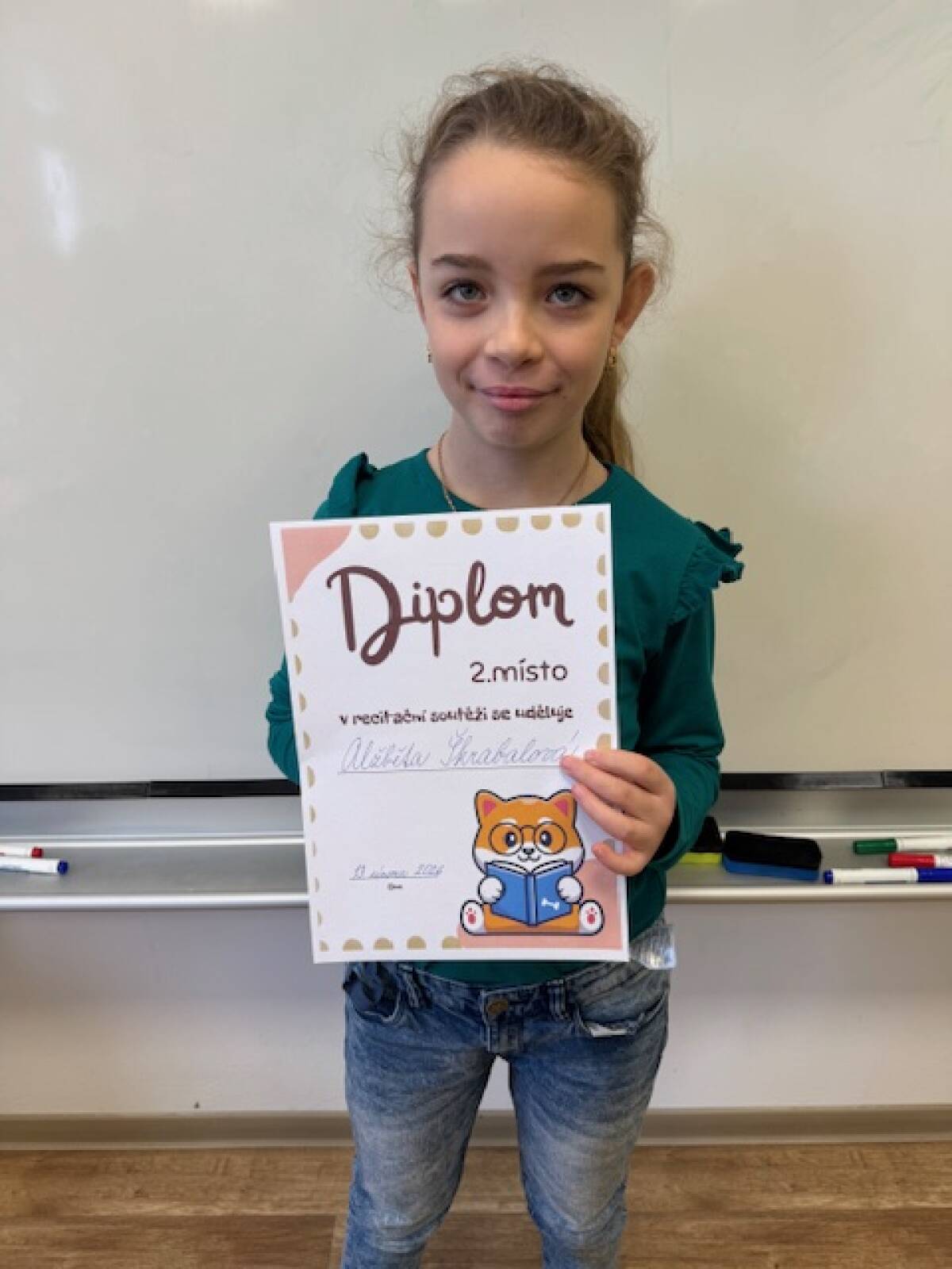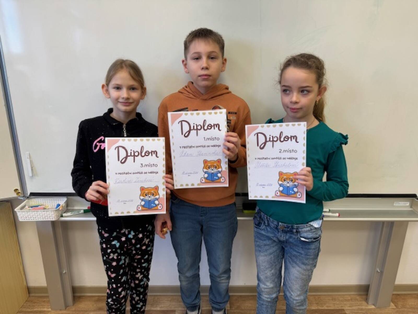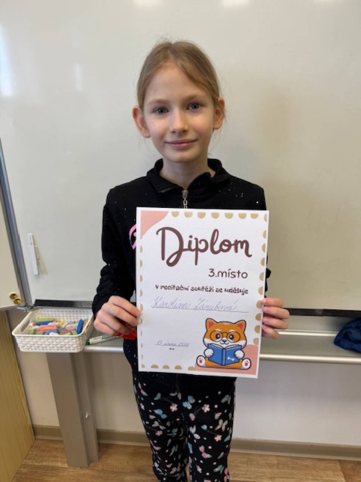 Dnes v naší třídě proběhlo třídní kolo recitační soutěže. Přihlášeno bylo pět dětí – Adam, Alžbětka, Ivetka, Karolínka a Klárka. Všichni své básničky odrecitovali skvěle a vybrat první tři místa bylo opravdu náročné. Do školního kola postupují: 1. místo Adam, 2. místo Alžběta a 3. místo Karolína. Všem moc gratulujeme a držíme pěsti do dalších kol!