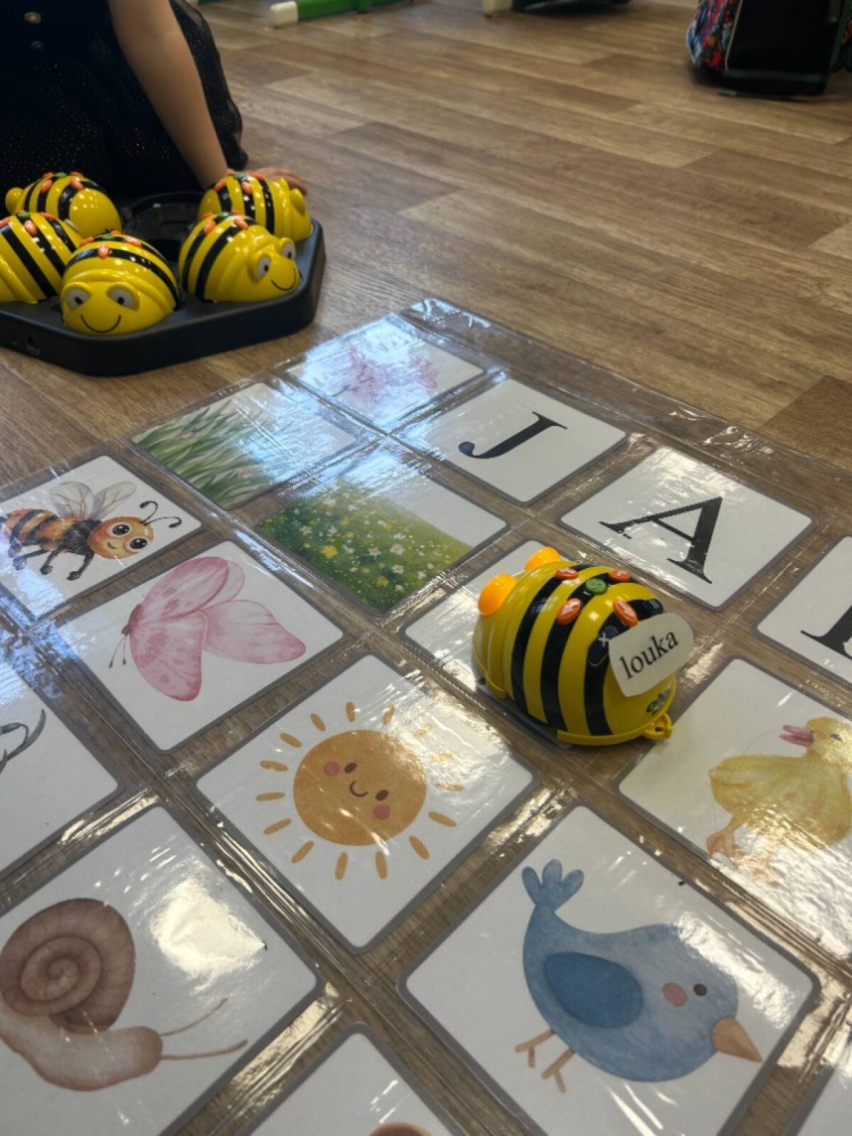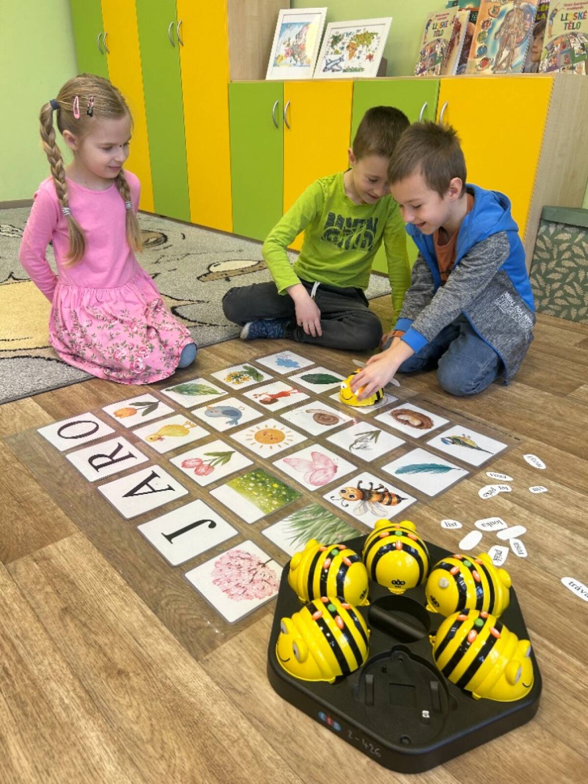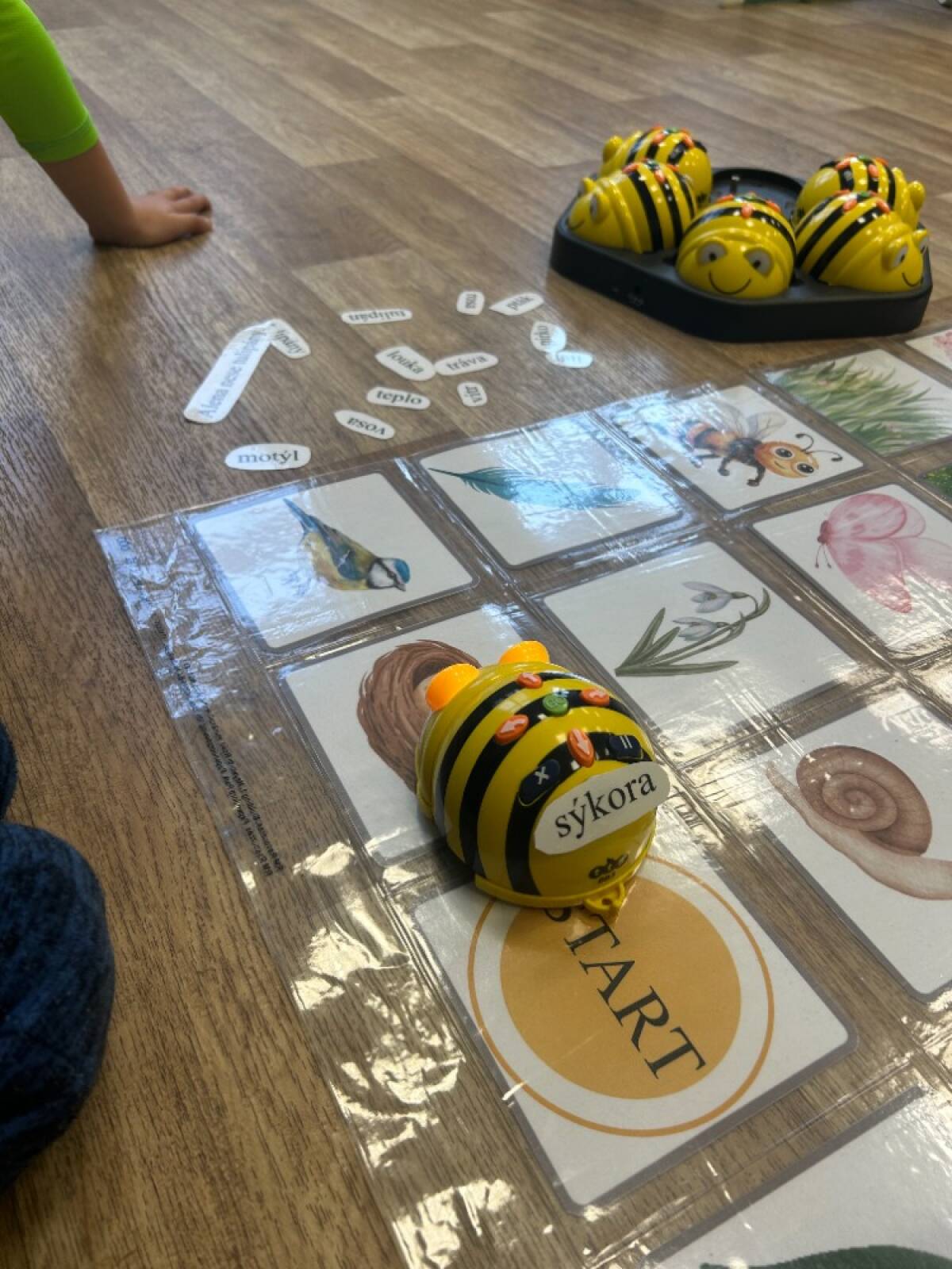 Velkou radost dětem přineslo také programování robotické včelky. Pomocí jednoduchých příkazů ji vedly po podložce s jarními obrázky, a přitom si přirozeně procvičovaly čtení slov, prostorovou orientaci i spolupráci ve skupině.