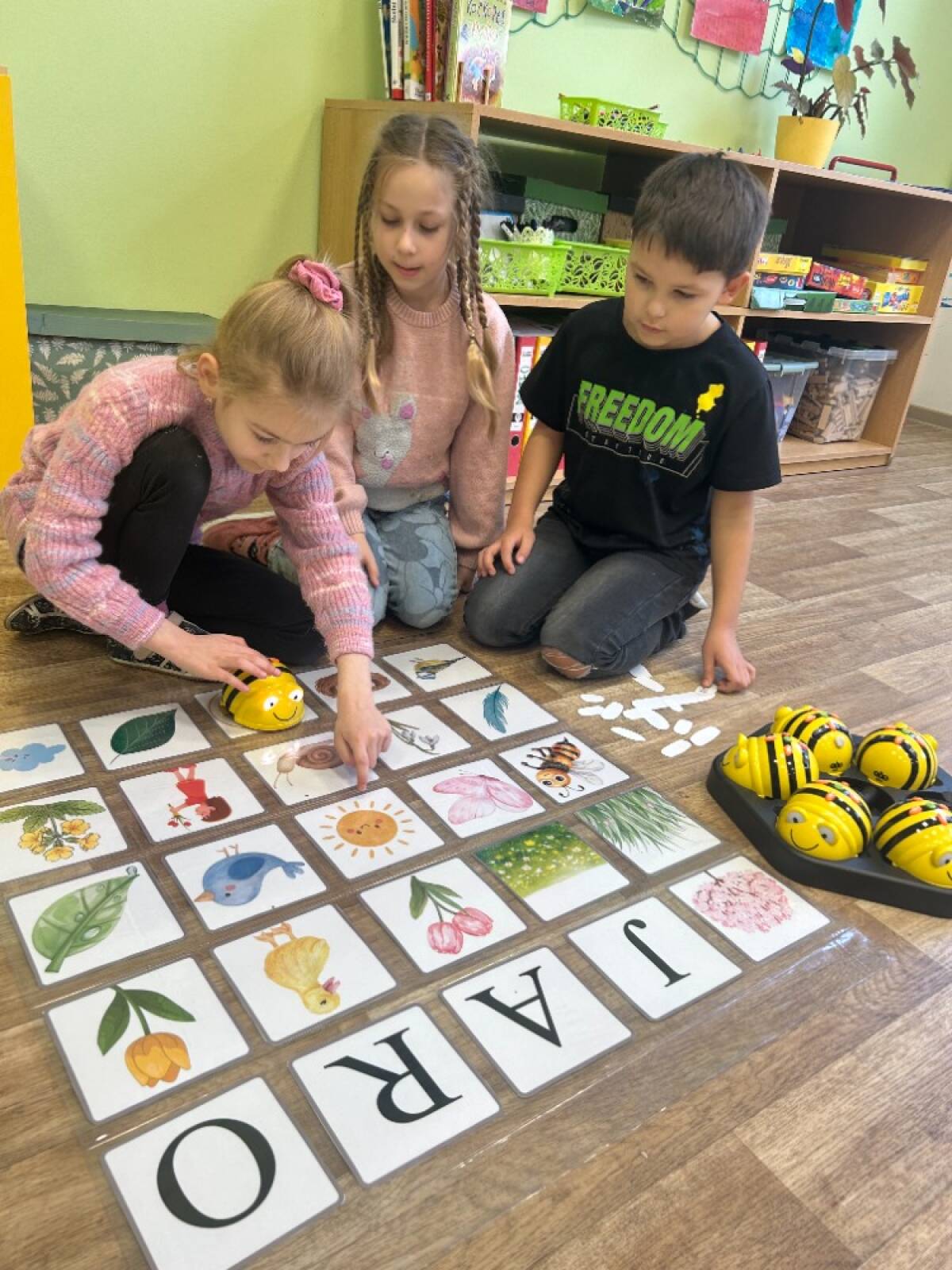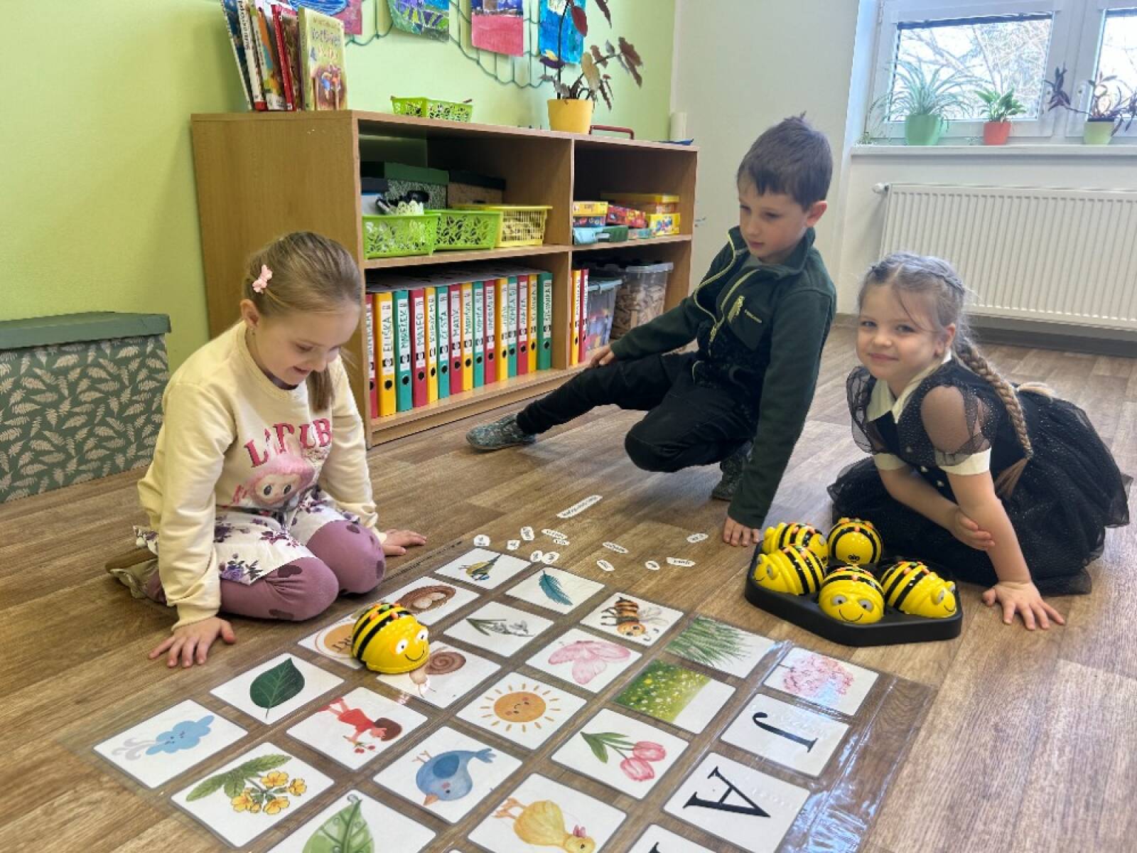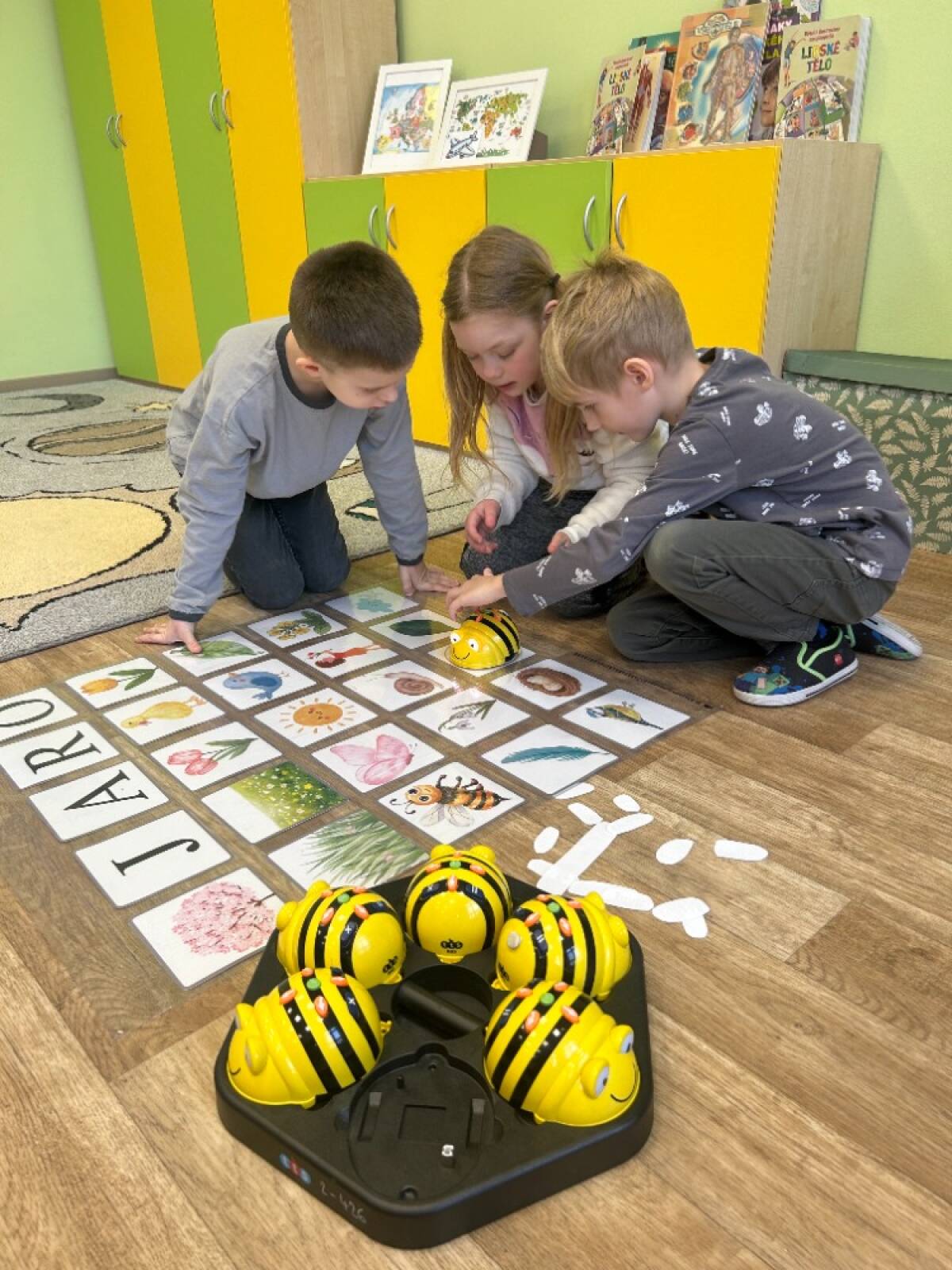 Velkou radost dětem přineslo také programování robotické včelky. Pomocí jednoduchých příkazů ji vedly po podložce s jarními obrázky, a přitom si přirozeně procvičovaly čtení slov, prostorovou orientaci i spolupráci ve skupině.