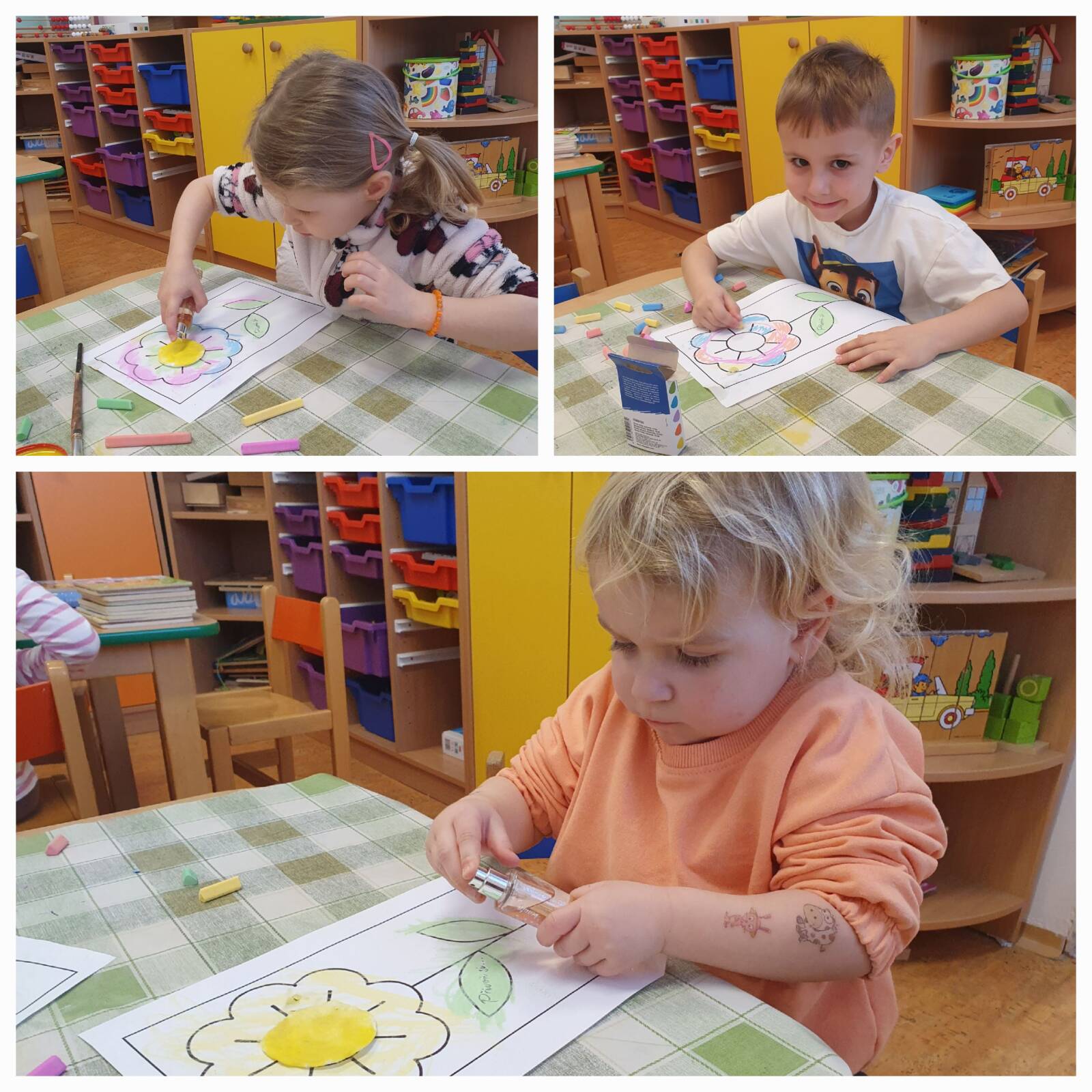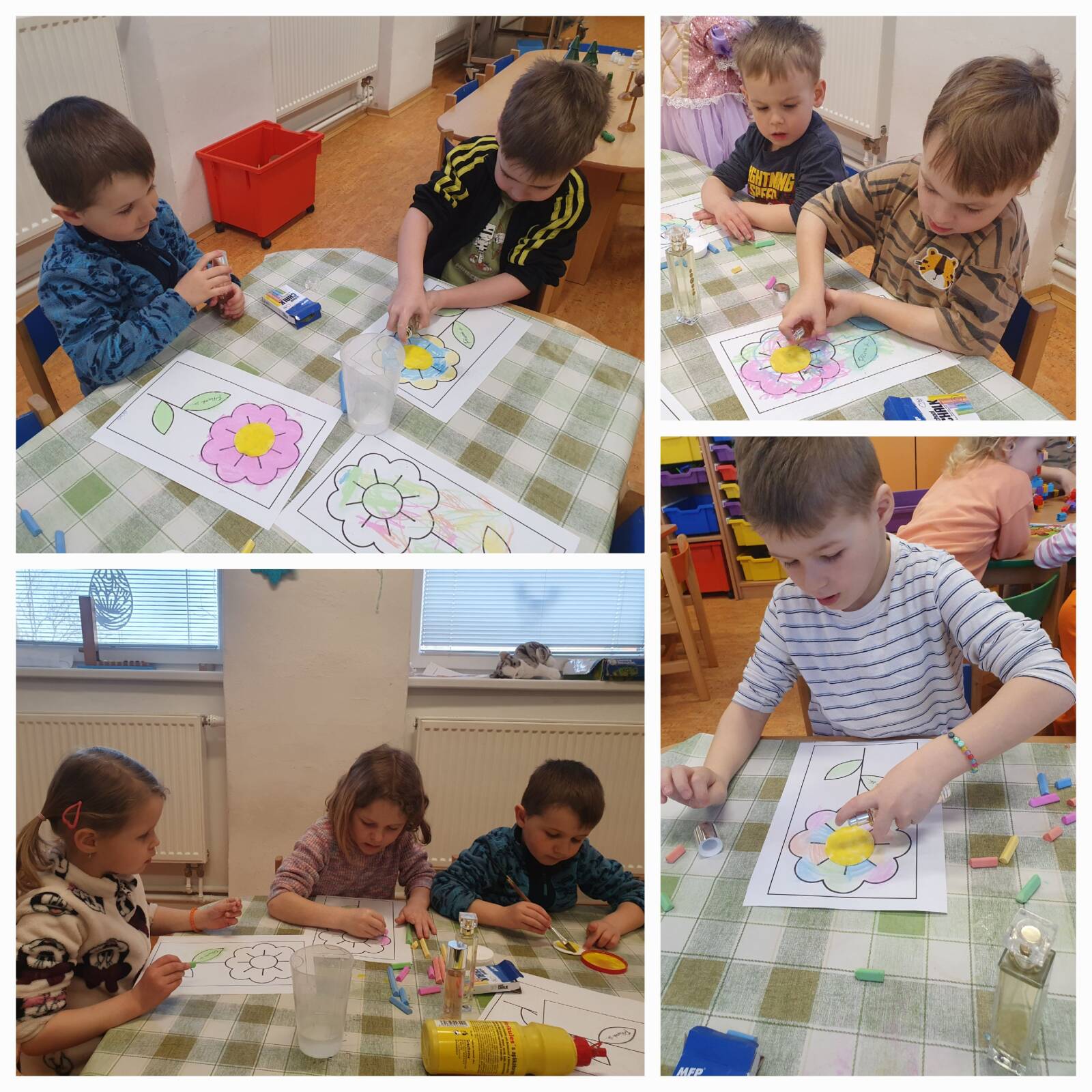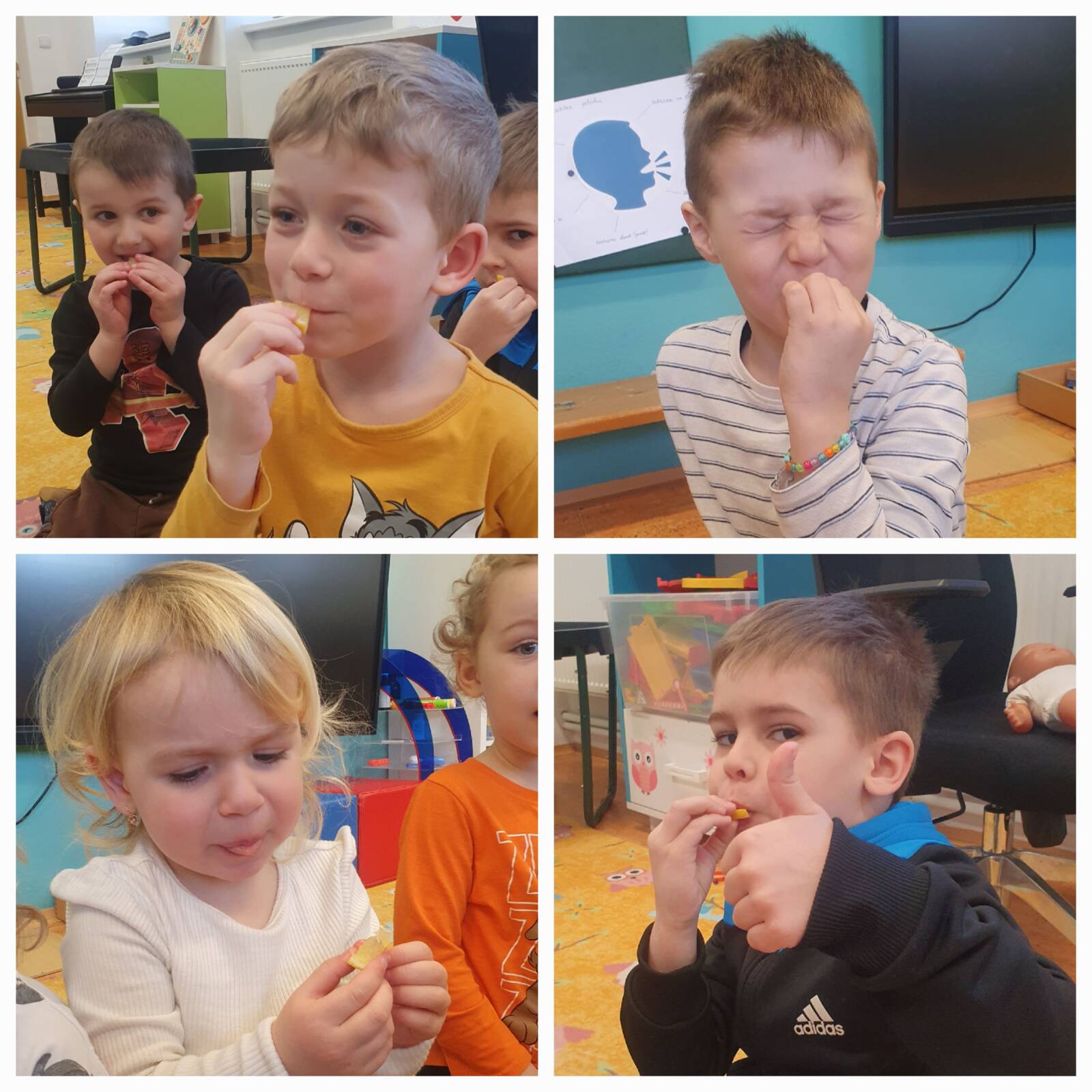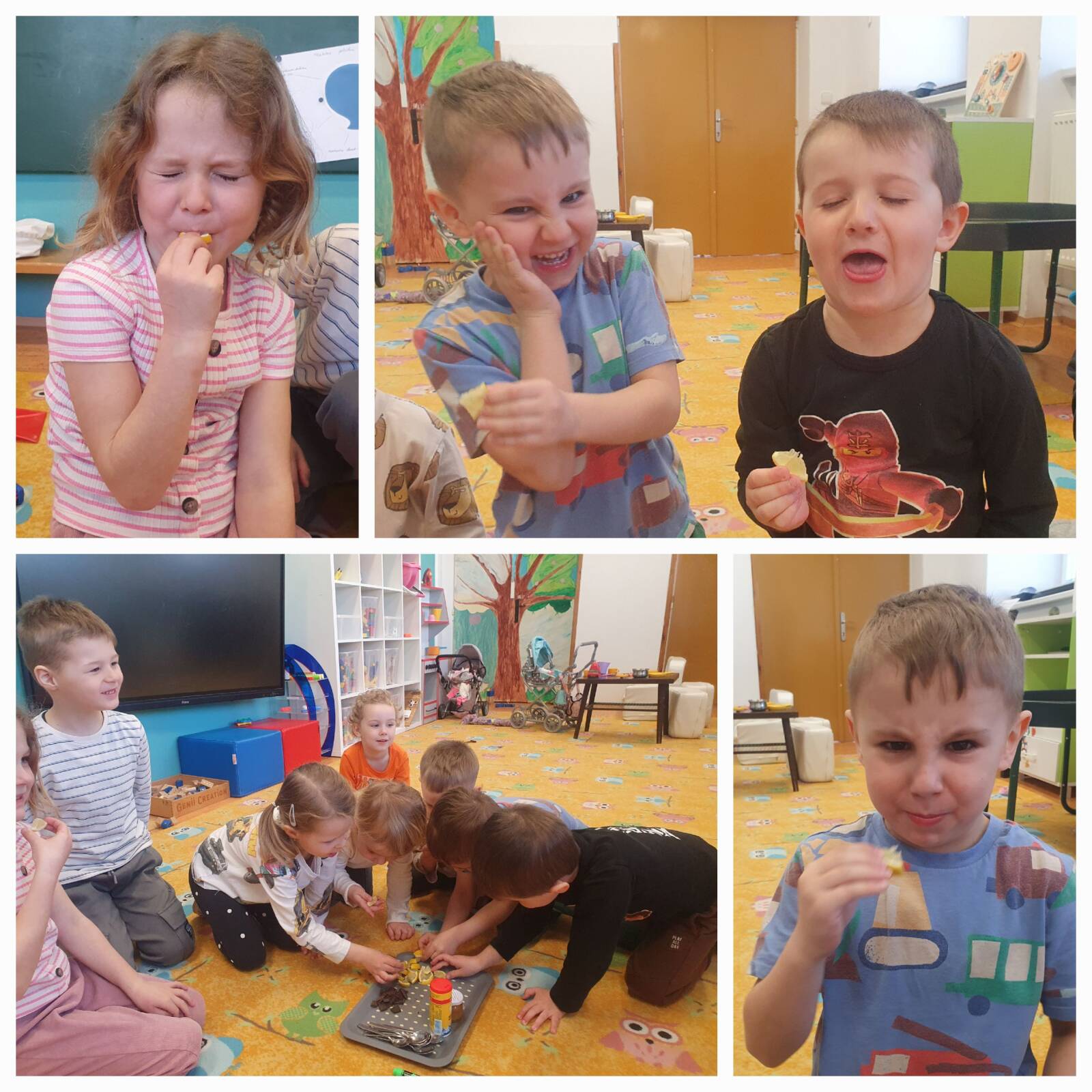 Začali jsme zrakem – Sovičky ve dvojicích prakticky míchaly barvy a pozorovaly, jak vzniká zelená, oranžová, fialová nebo růžová. Zrakem jsme sledovali také zapouštění barev do klovatiny při tvorbě papírového oka. Sluch jsme procvičily pomocí ozvučných kamenů rozlišováním stejných a různých tónů. Využili jsme hmatový pytlík, děti se „dívaly“ rukou a vyhledávaly daný tvar. Nezahálel ani čich – děti si vytvořily kytičku, která díky parfému opravdu voněla. Velkým dobrodružstvím bylo vnímání chutí, kdy Sovičky ochutnaly kyselé, hořké, slané i sladké. Při ochutnávce citronu jsme se všichni skutečně pobavili.