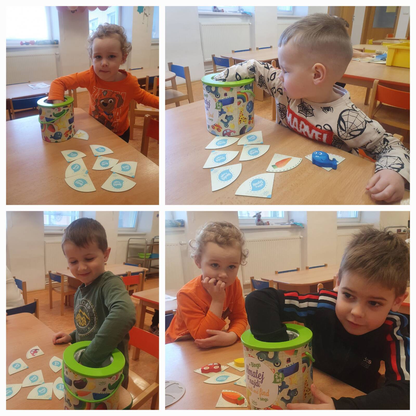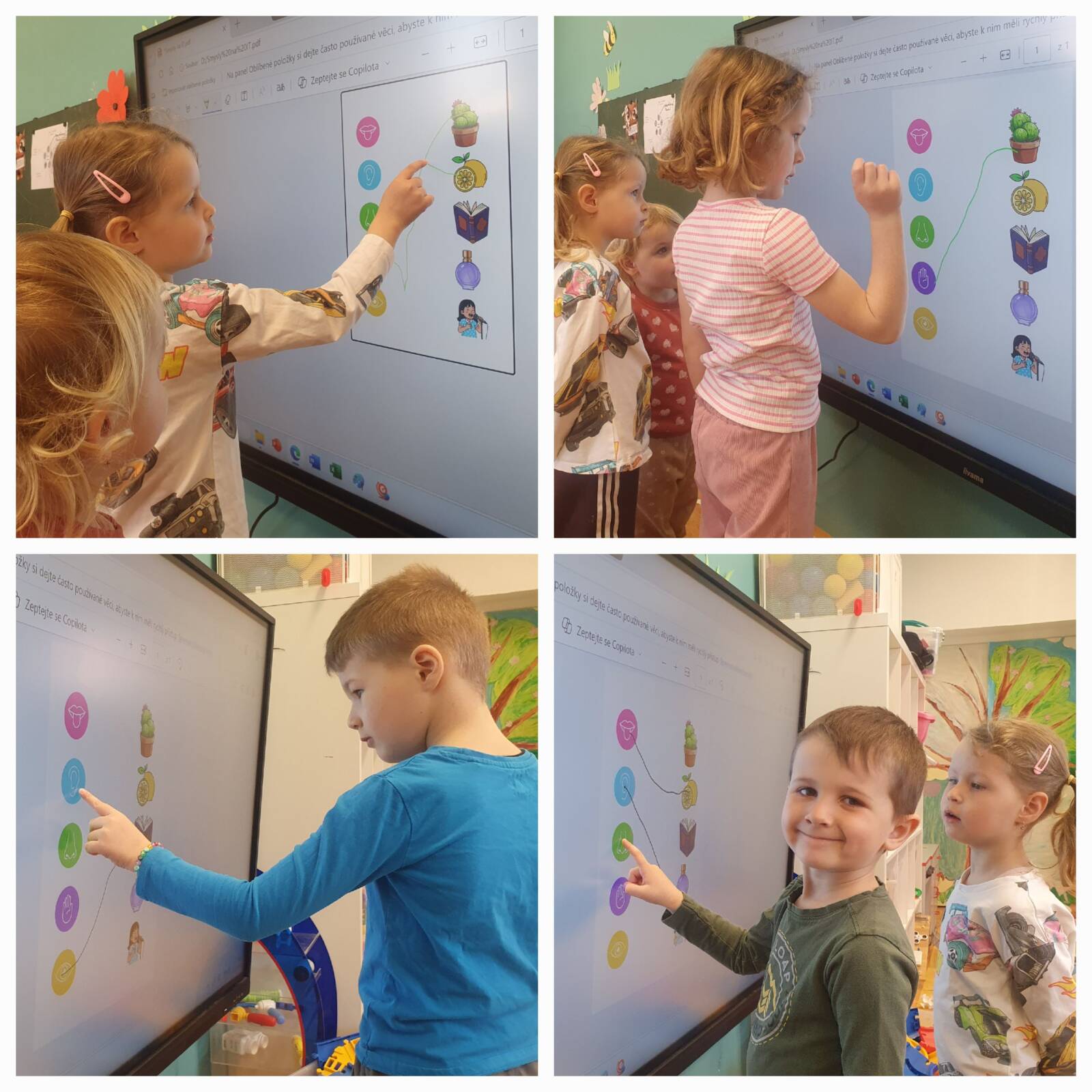 Kromě prožitkových aktivit děti pilně pracovaly nejen na interaktivní tabuli, ale i při plnění pracovních listů. Celý týden nás provázela tematická písnička „Smysly“ a oblíbené hry Lepidýlko a Na kukačku.