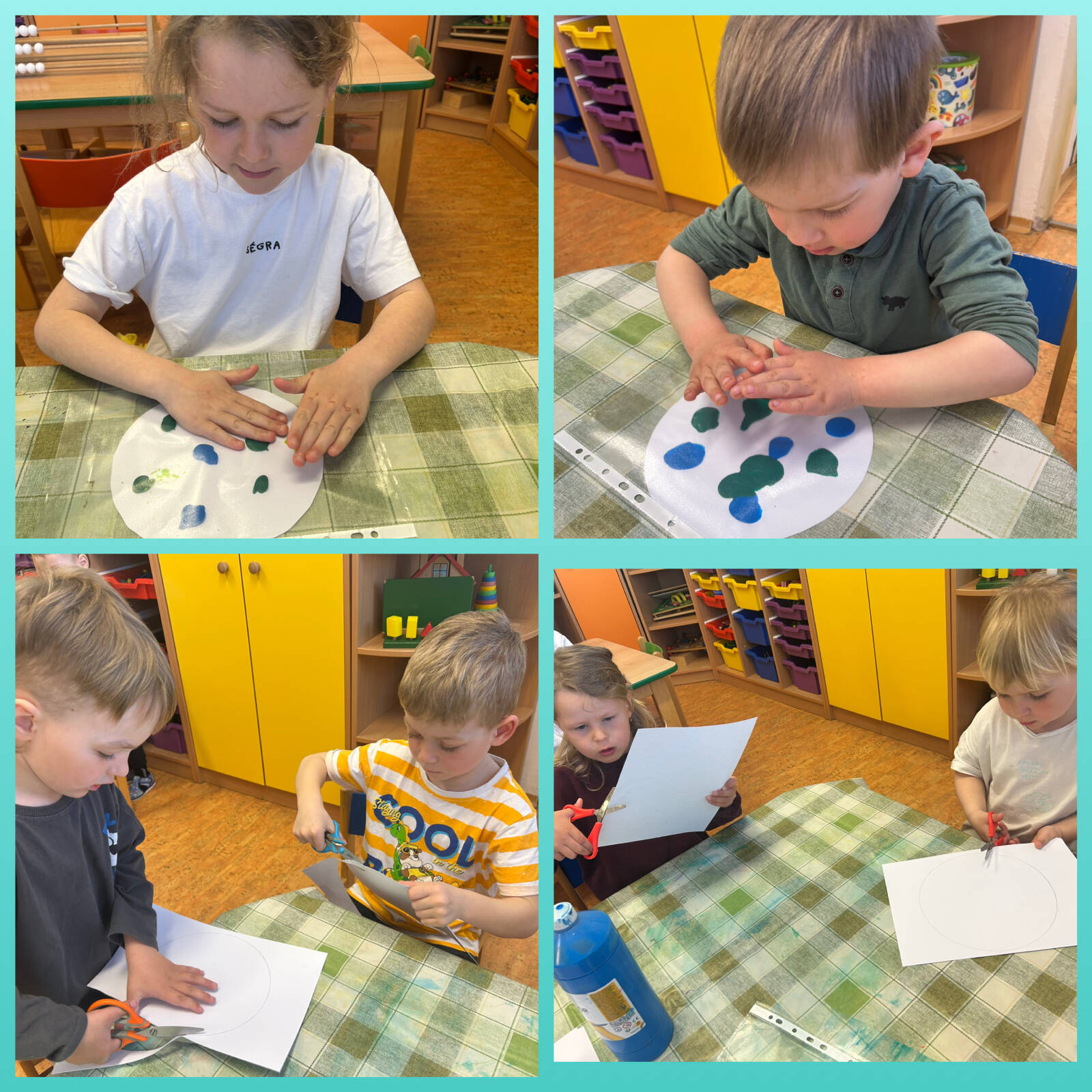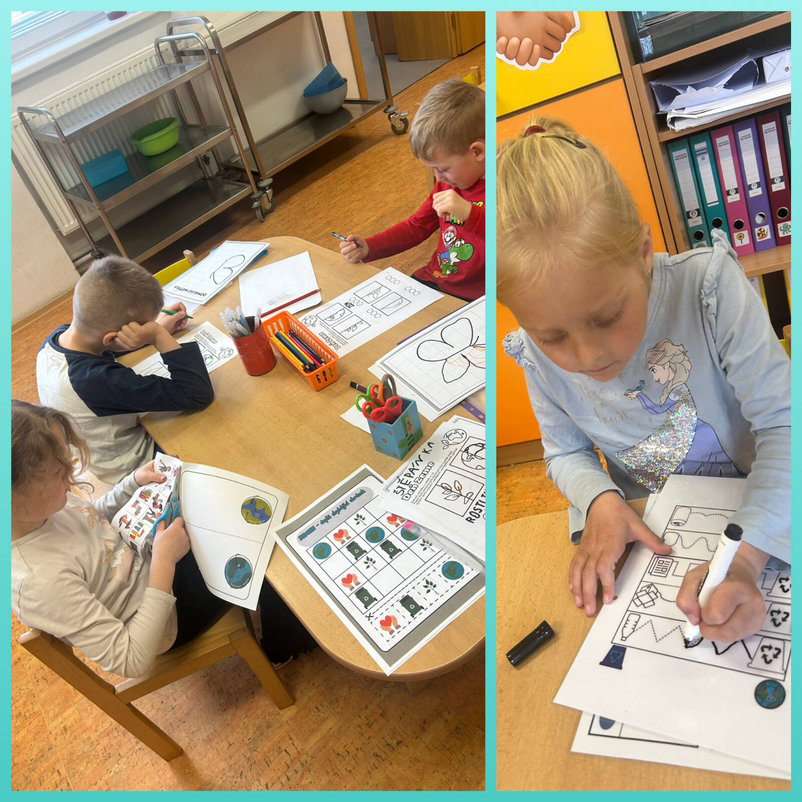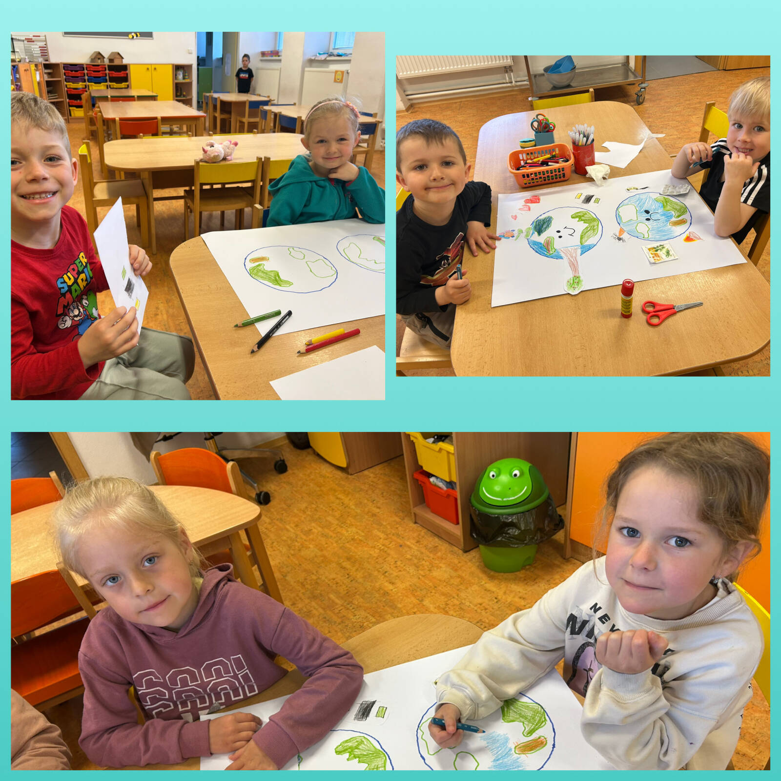 Vyrobili jsme si vlastní zeměkoule či skupinovou koláž ,, veselá a smutná Země", kde děti znázornily, co je pro naši planetu dobré a co ji škodí.