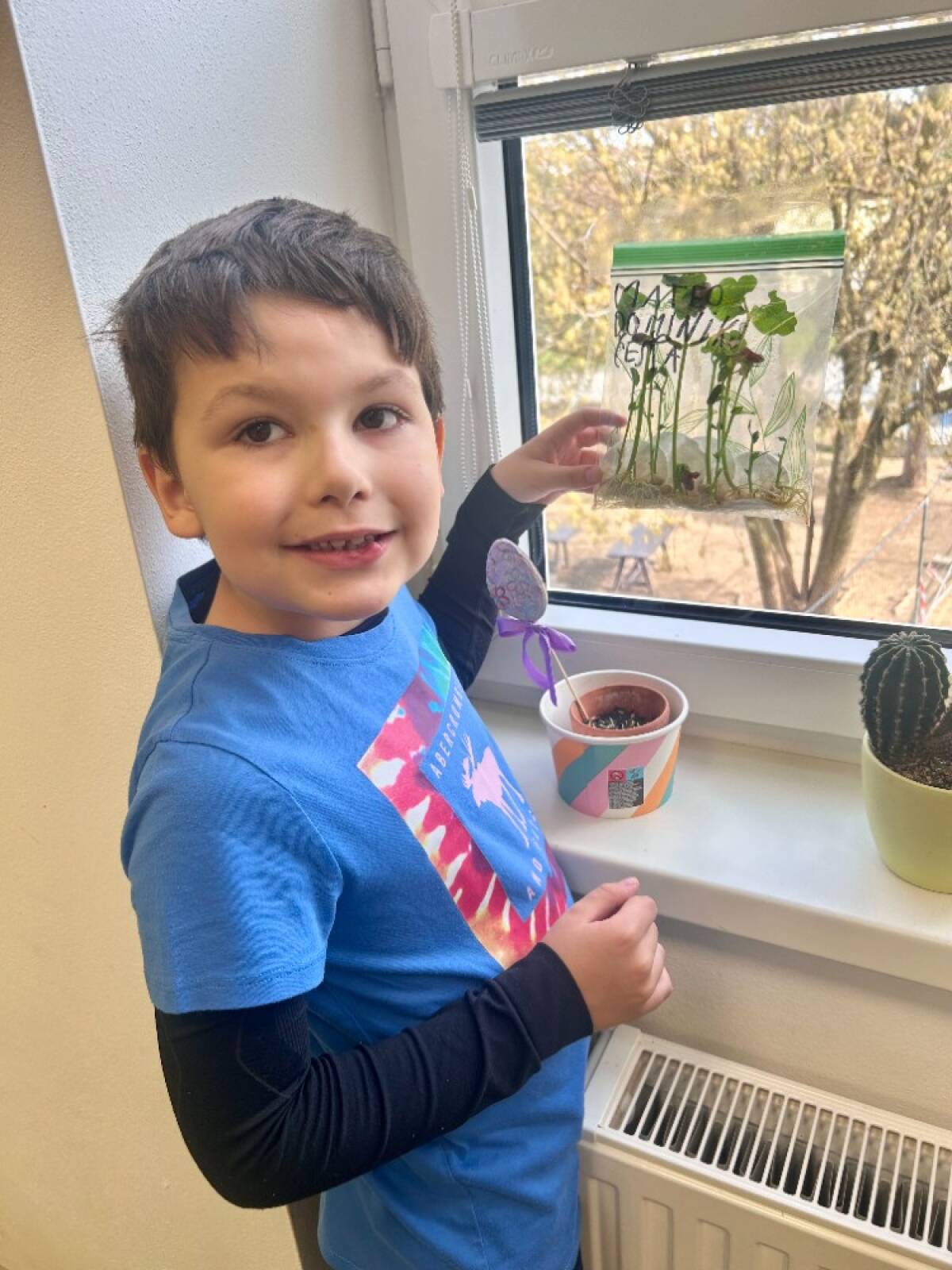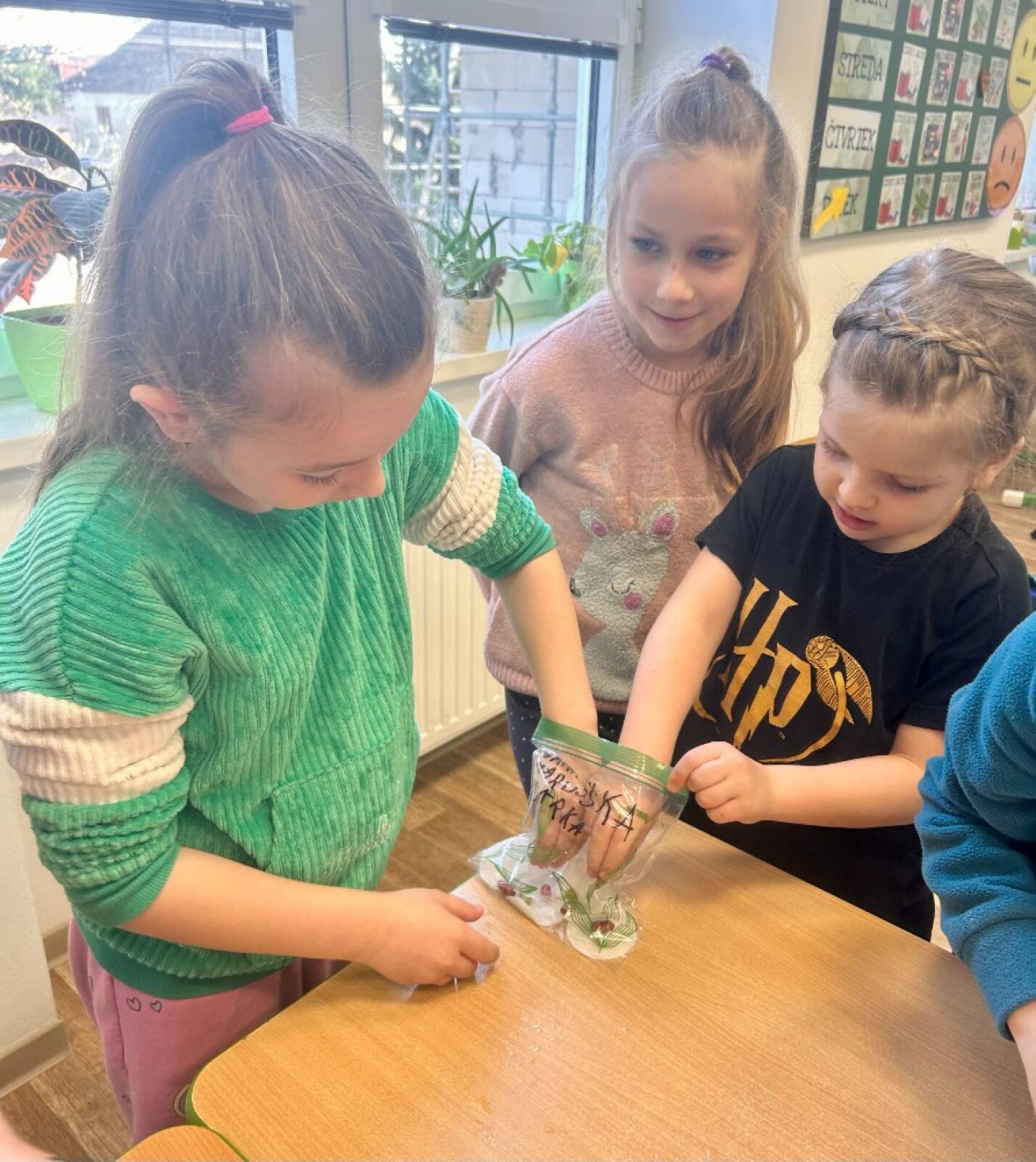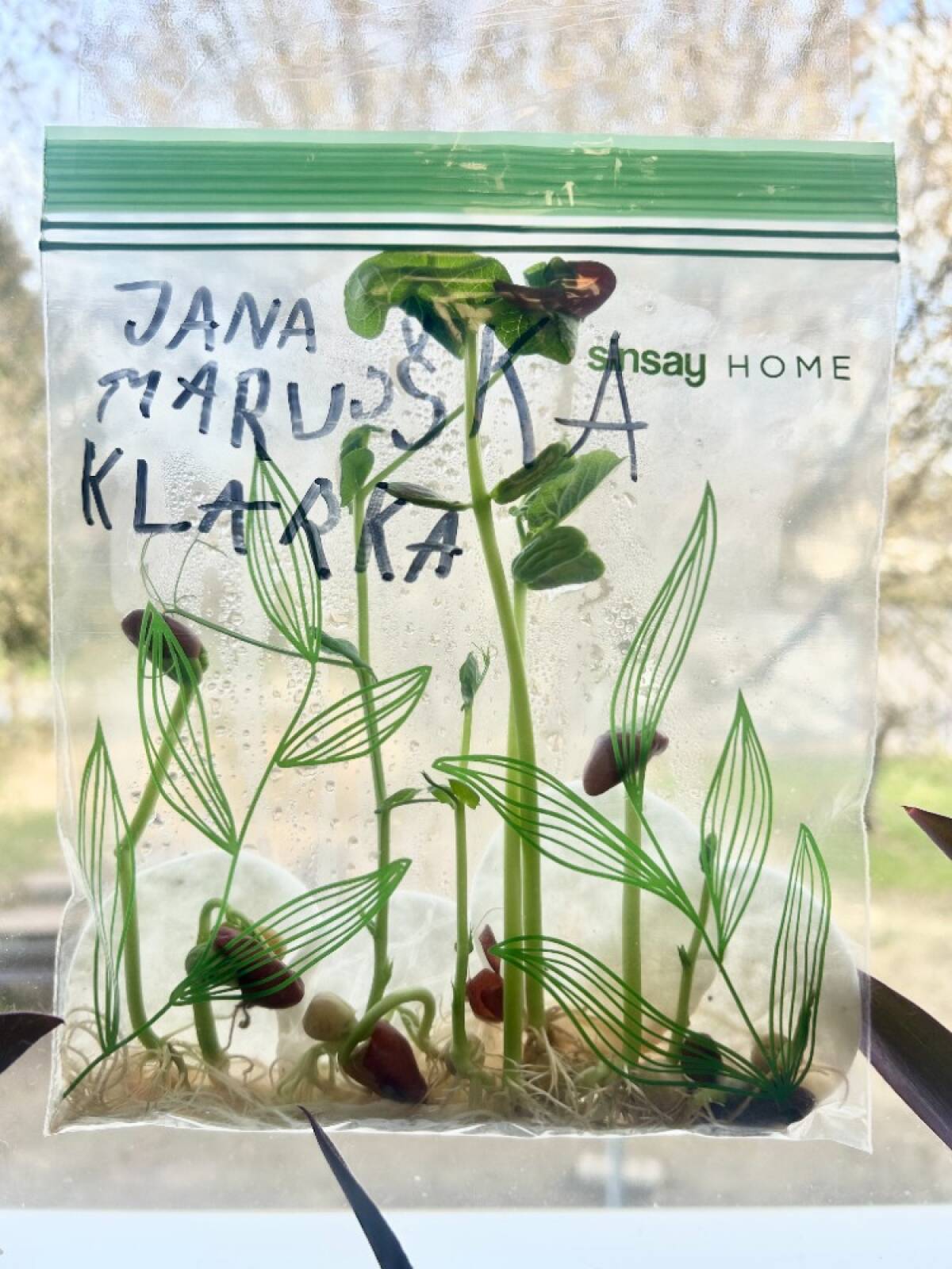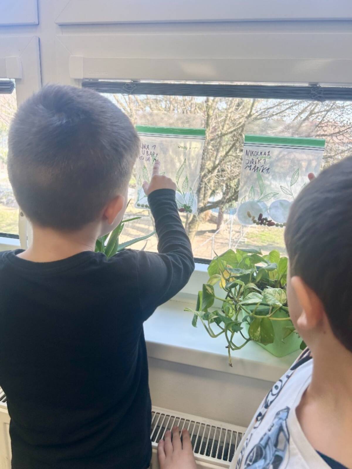 Semínka jsme vložili do průhledného sáčku s navlhčenou vatou a sáček jsme přilepili na okno ve třídě. Díky tomu měly rostlinky dostatek světla a děti mohly každý den pozorovat, co se se semínky děje.